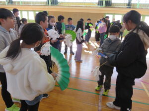 その後、舞い方をご教授いただき、6年生から3年生へと引き継ぎを行いました。